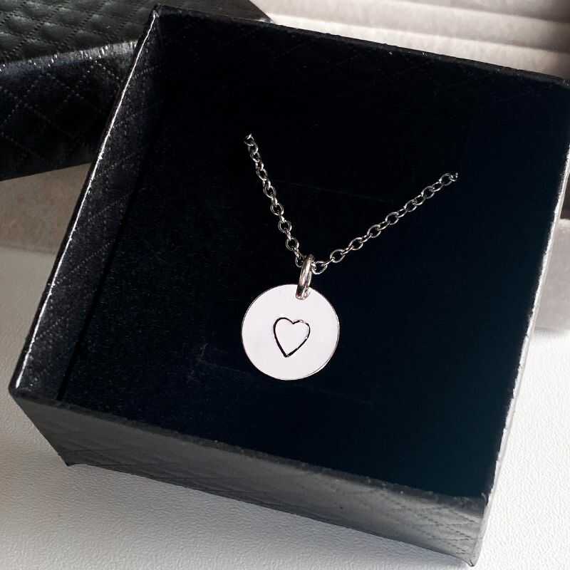 Cadena en acero con dije medalla enchapada en oro o plata con corazón grabado a mano.