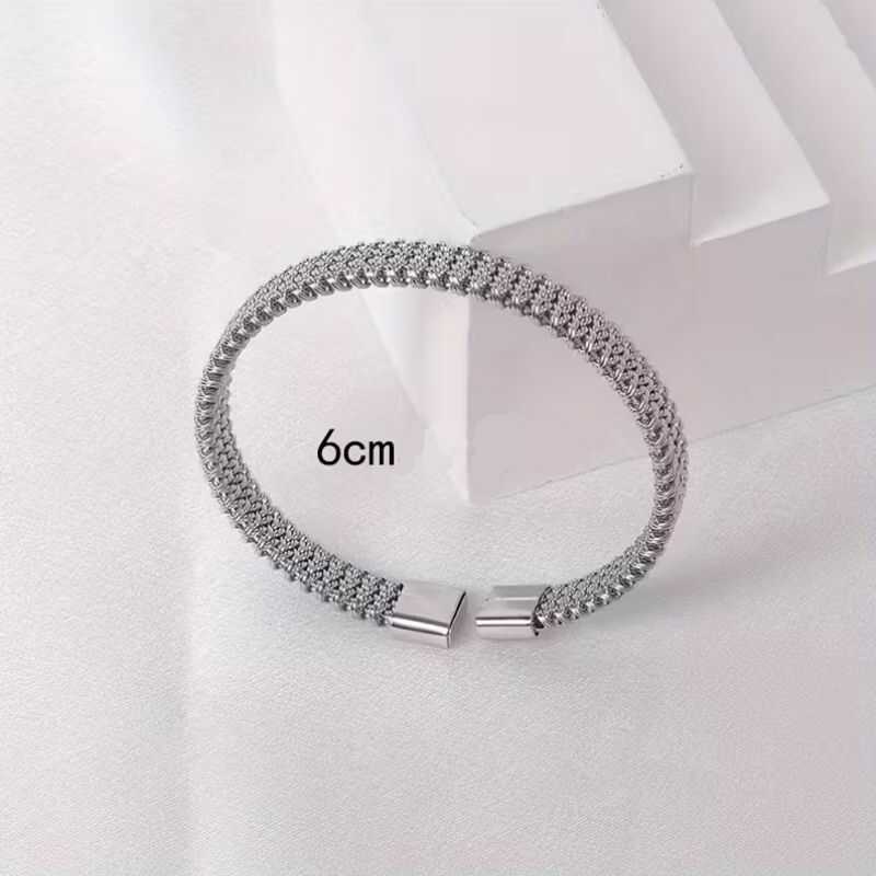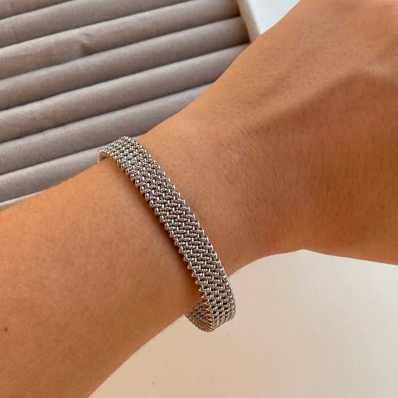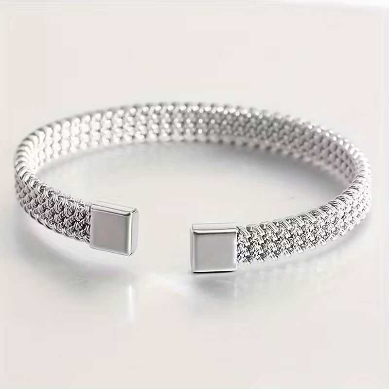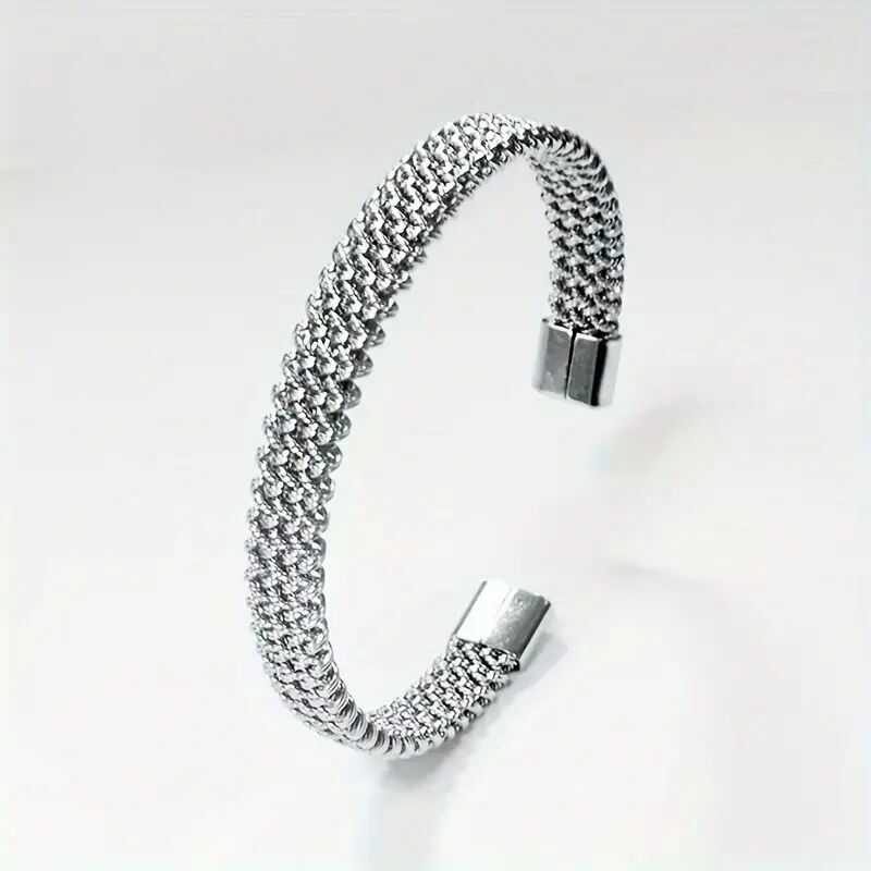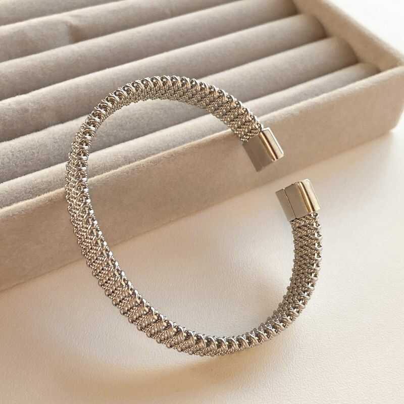 Pulsera, brazalete, esclava abierta diseño malla, en acero quirúrgico plateado.