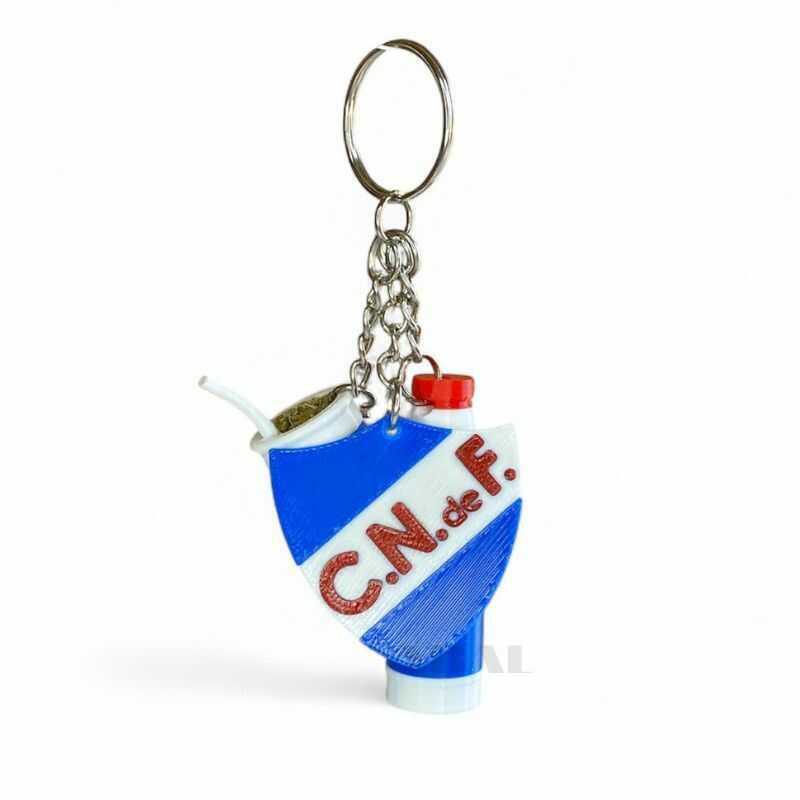 Llavero con escudo, termo y mate en azul, blanco y rojo de Nacional. Diseño realizado con impresora 3d.