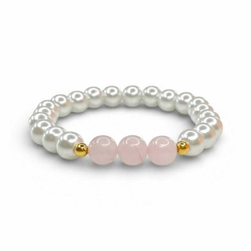 Pulsera de perlas de vidrio y piedras naturales Cuarzo rosa.