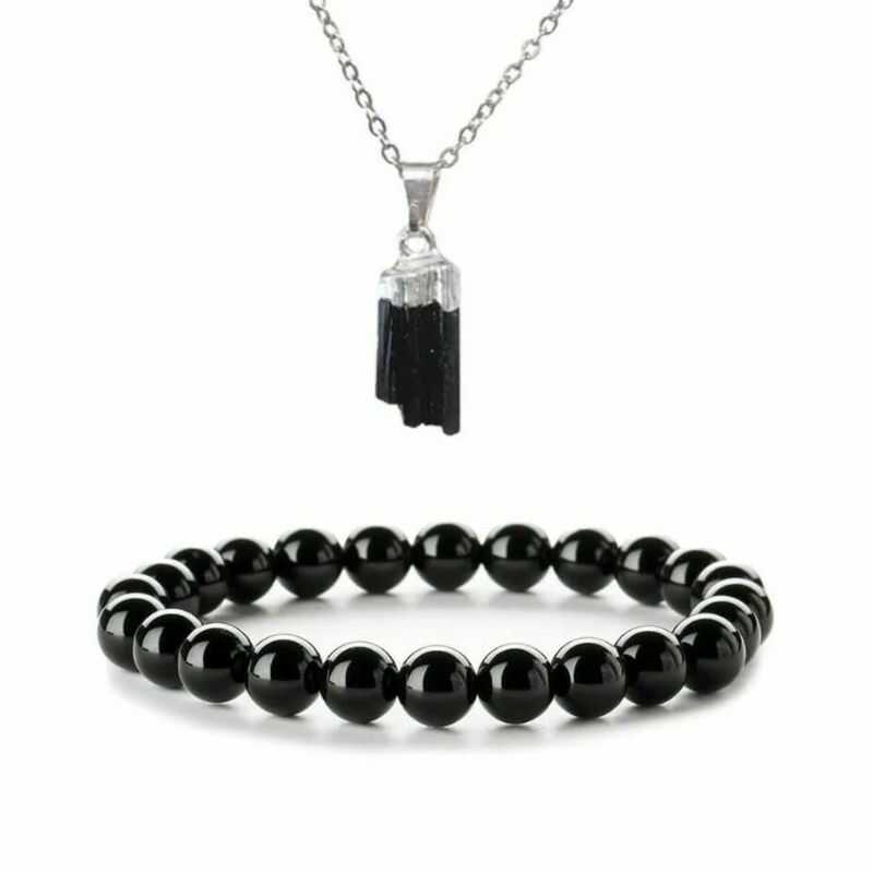 Set de piedra natural Turmalina negra, incluye pulsera y colgante con piedra en bruto.